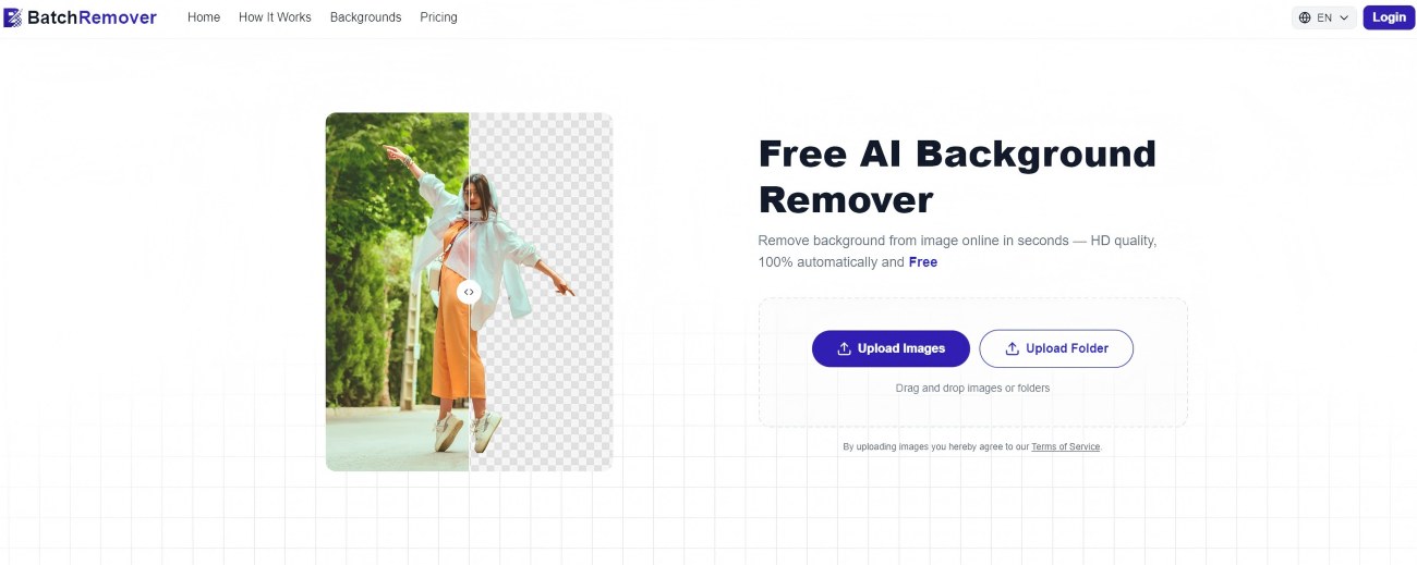 Go to BatchRemover, upload your image, and download the transparent PNG result. No account required. Single image processing is free with no watermark on the output.